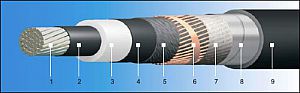 Кабель с изоляцией из сшитого полиэтилена в полиэтиленовой оболочке с продольной и поперечной герметизацией на напряжение 10 кВ ПвПу2г